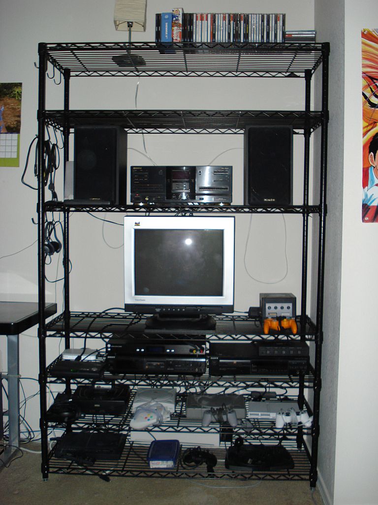 Right side: CD player, MD deck, CRT monitor, Composite/S-Video to VGA adapter, switchboxes, receiver, consoles PS2 and older (newer consoles are in the living room)