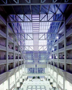 They knocked out the center portion of floors three through nine, leaving office space all around, and installed lots and lots of glass, so it has this massive open atrium in the middle, a largely open floor on the second floor, and then conference rooms and exits on the bottom floor. There are four glass elevators that look out on to the atrium… it actually hits everyone with a touch of vertigo the first couple of weeks you work there but it is really pretty.