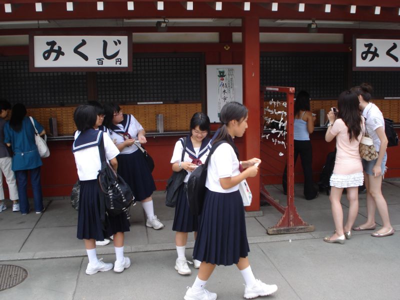 After this, we took the Yamanote around to Ueno and the Ginza Line subway to Asakusa, where we surfaced for Senso-ji. It was, as usual, full of throngs of people, but more throngy than usual because it seemed as though at least two schools had sent their students there for a day of being cultural, which is to say that the boys were hanging out in groups trying to culturally outmacho each other and the girls were hanging out at the fortune-seller buying fortunes and giggling in highly cultural fashion.