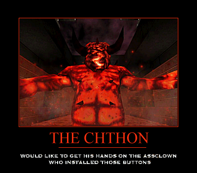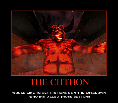 These were rather handy things to know in advance, because when I finally DID run in to him, instead of wasting time trying to kill him with bullets, I ran around a bit asking myself helpful button-related questions like “If I were a button, where would I be?”, and wound up Seriously Inconveniencing the Big Red Guy in very short order.