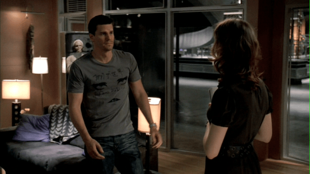 The other night, we’re watching this program, and after a family-friendly 40 minutes of the main characters trying to track down the killers of a guy who was found mostly dissolved in a bathtub full of …I want to say acid, but I think it was actually a strong base. Lye’s a base, right? “Acid” sounds cooler… anyway, after the main story is resolved, Angel Booth and Temperence are talking in her office, and I notice that Angel Booth’s shirt is written in Japanese, and then I have to pause the episode and go back to make sure that it says what I thought it said.