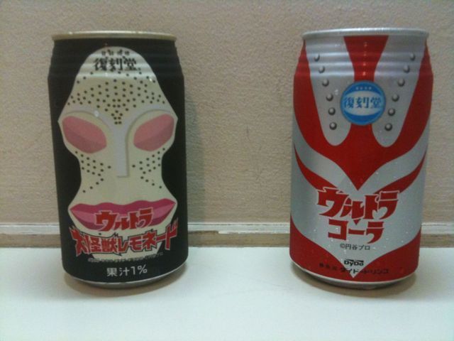 Anyway, today’s item: Ultra cola. Actually, Ultra Cola AND Ultra Lemonade, though the lemonade is more properly based on Ultraman’s enemies. I saw these in a vending machine in Mukougaoka, which is a place name I wouldn’t like to say three times quickly, and invested 200円 into the purchase of a can of each.