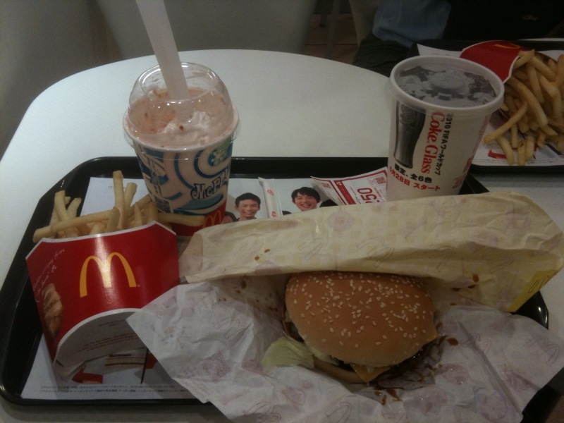 Anyway, the current seasonal burger in Japan is the Teri Tama burger, available also with cheese as the cleverly named “Cheese Teri Tama” burger, and I ordered one of those. I also went for the strawberry-yogurt McFlurry, probably because I figured I wasn’t doing myself enough harm with the burger.