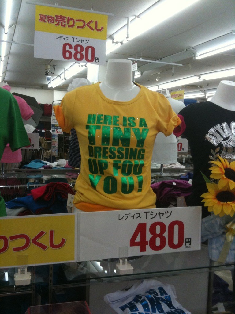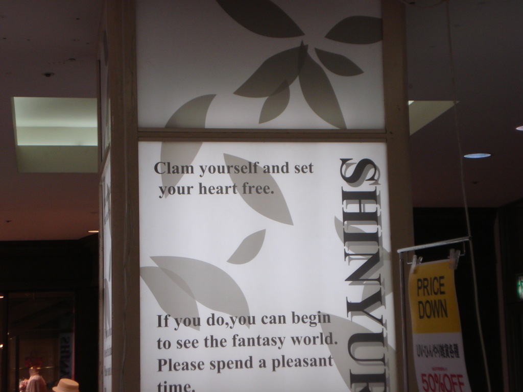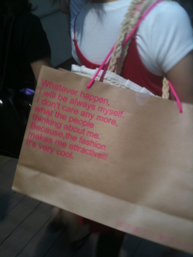 This is probably my favorite from the whole trip. It’s not just the slightly off-kilter English, it’s the message: “I don’t care what people think about me. I have bigger things to worry about. Like, say, bolstering my sagging self esteem through buying clothing.”