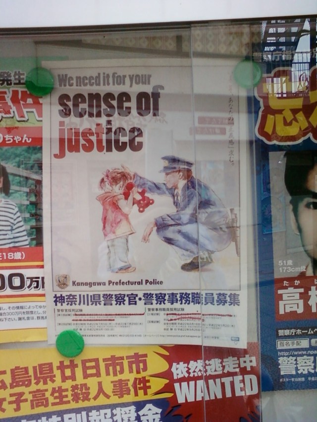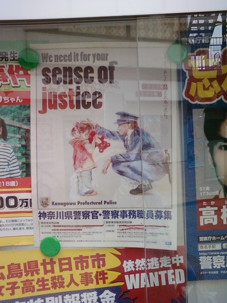 Poster at a police station. This one was behind glass so it’s not a terribly good photo. There was a much larger poster of this up in the local train station, but when I went back to take a photo of it, it’d been replaced with an advertisement. I guess the train station didn’t care much about your sense of justice.
