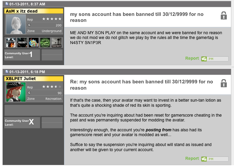 This is the forum where people who’ve – generally – done something dumb with their Xbox or with their Live account go in order to ask why they’ve been banned and if they could pretty please have their account back and swear they’ll never do it (whatever it is, though of course they did nothing wrong in the first place) again, and are told, simply, “no.”