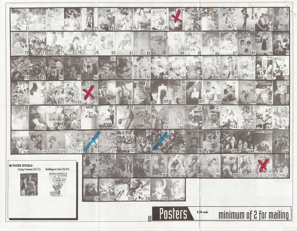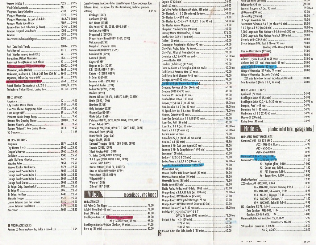 Page 1: CDs. Note that the CD I REALLY wanted to get, the Gunbuster soundtrack, is marked off in blue ’cause they were low on stock. By the time I called, they were out of stock. 18 years later, I still don’t own this CD.