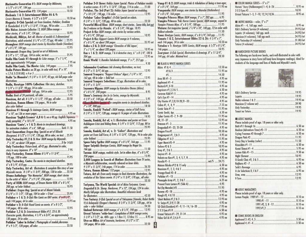 Page 3, 4, and 5: Models, books, magazines, manga. English-translated manga is on page 5. These were prices for single “issues”, which were usually two chapters from a given manga and about 32 pages long. VERY expensive compared to the Japanese originals, but you could actually read them.