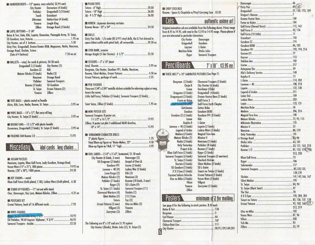 Page 6: Miscellany, posters, pencilboards, etc. Looking at this now, I really wish I’d gotten some of the 10 Little Gall Force trinkets on offer, or those Ranma door curtains.