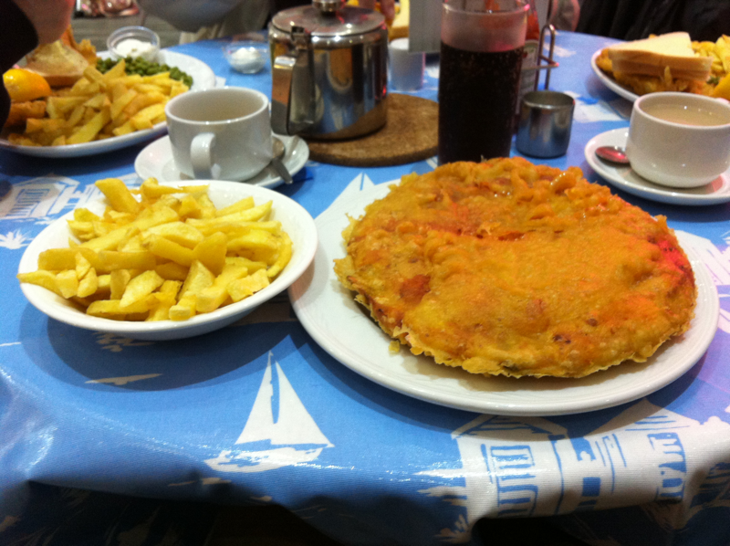 Oh, and it’s been dipped in batter and deep fried and it comes with a plate of fries – pardon me, “chips” – on the side.