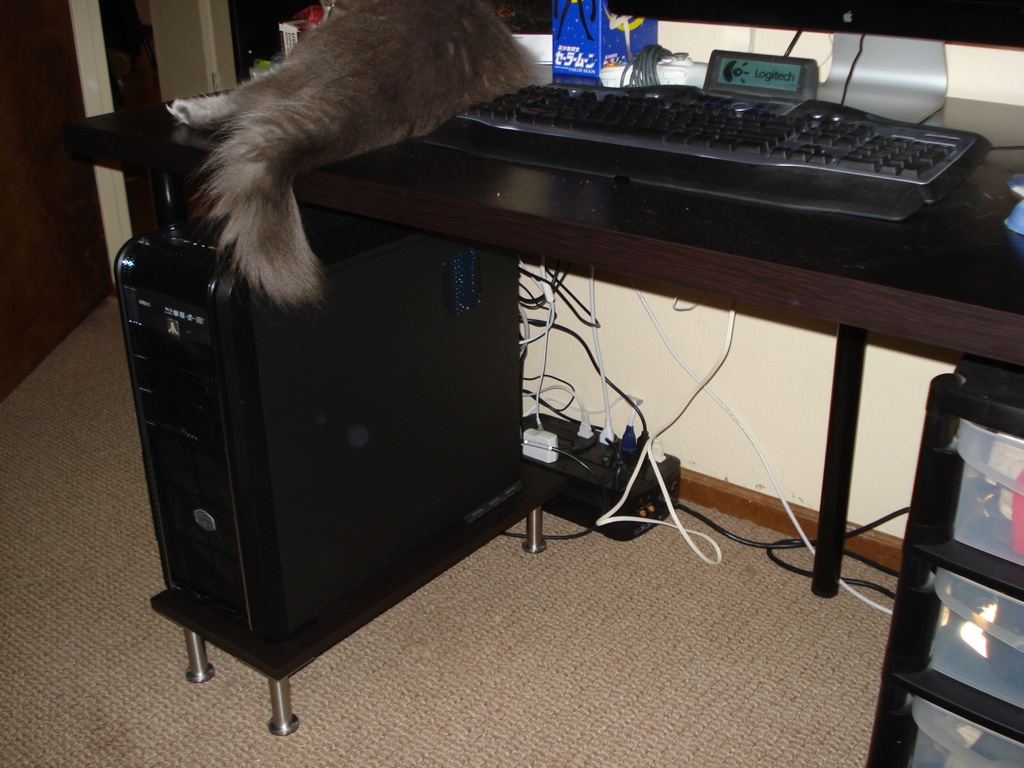 My PC is in a Cooler Master CM690 case, which is an awesome case but which has intakes on the bottom. I made a riser for it out of a drawer front and some Capita legs: