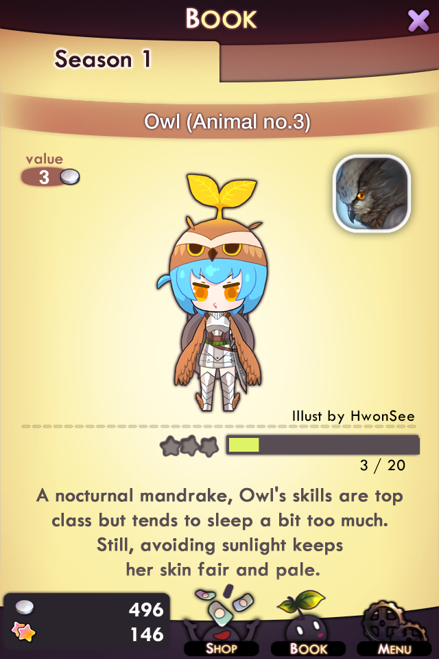 As you collect mandrake characters, they go into a book where you can look at the ones you’ve collected. Each one gets a description and you can further spend in-game currency to unlock an illustration of the character.