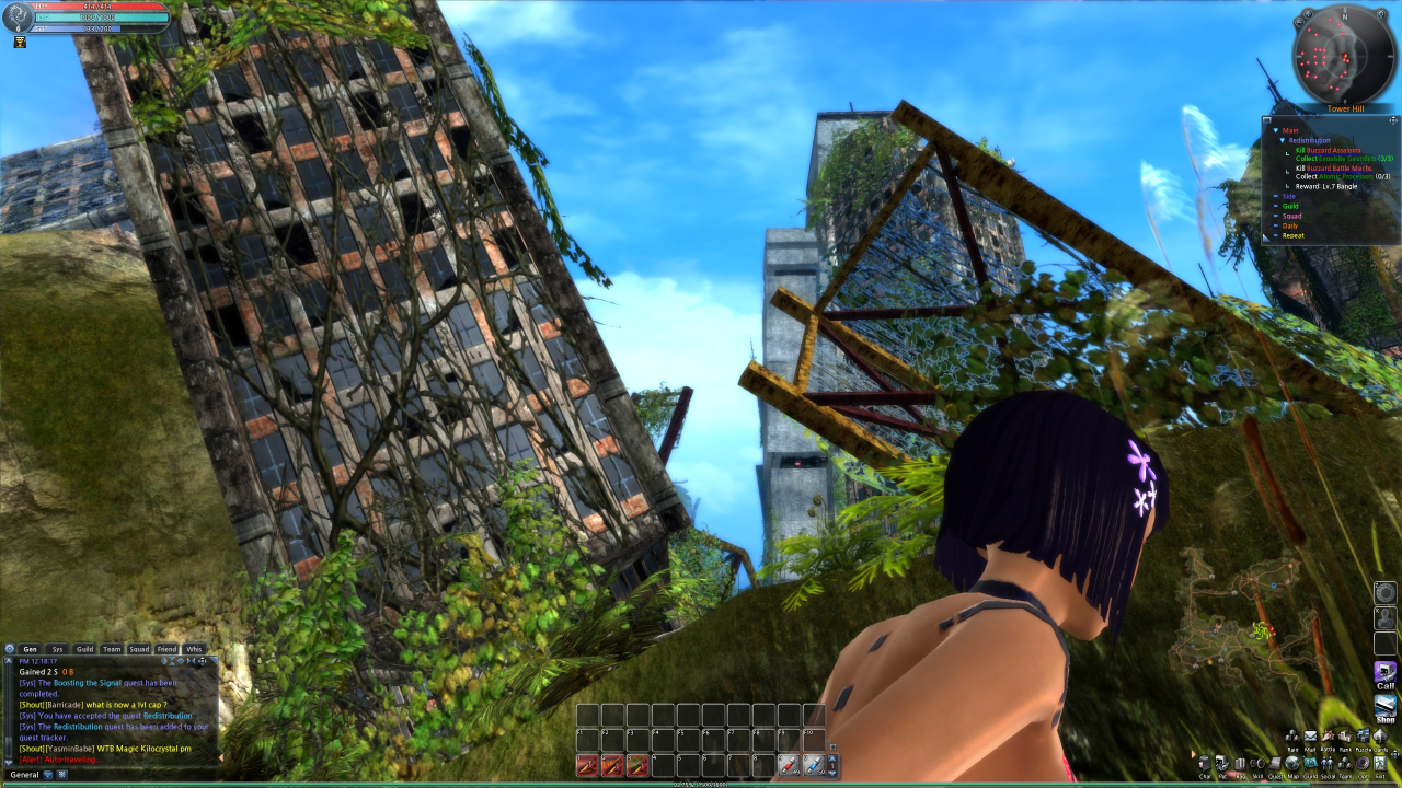 You also don’t have to pay too much attention to directions, because simply clicking on the word “Rats” in “kill 10 rats” sends your character zooming across the map on her motorcycle to the place where you can find rats to kill 10 of, although – and this ought to be noted – she’s not too good about avoiding hostile NPCs in the process so you may take a few hits along the way. This is very similar to Lucent Heart and I suspect it’s a common thing in these sorts of MMOs. It’s very handy anyway.