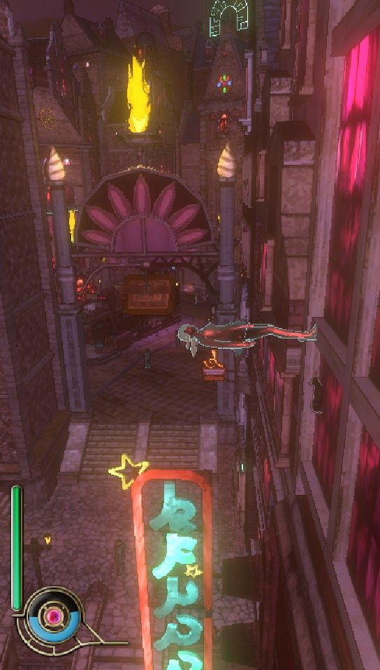 The world of Gravity Rush is a collection of psuedo-European towns on floating sky islands, connected by trains and aircars. For some reason, bits of these flying islands have been breaking off and disappearing, and the plot, after a couple of introductory tutorial-style missions, revolves around you (a) restoring these missing islands from surreal alternate dimensions and (b) foiling the plans of a master thief.