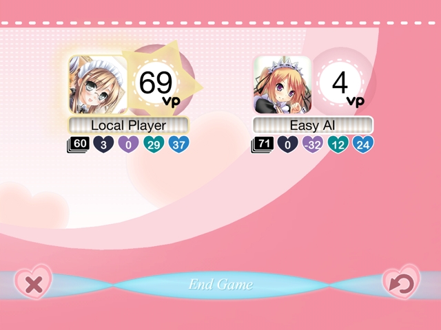 Speaking of scores, which is a pretty awkward segue I admit, I was puzzled for a while by not being able to see the scores of the other players until the end of the match. I eventually figured it out, however – pretty much any player can make the end of match condition happen after about turn 15, so being able to see everyone else’s score would eliminate the need to hesitate before actually pushing the button on this- you need to hold off until you’re pretty sure you have the upper hand.