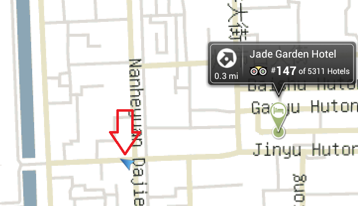 As an example, in the following image, the red arrow indicates the ACTUAL location of the Jade Garden Hotel. For extra confusion, there IS a hotel roughly where the TripAdvisor arrow is pointing.
