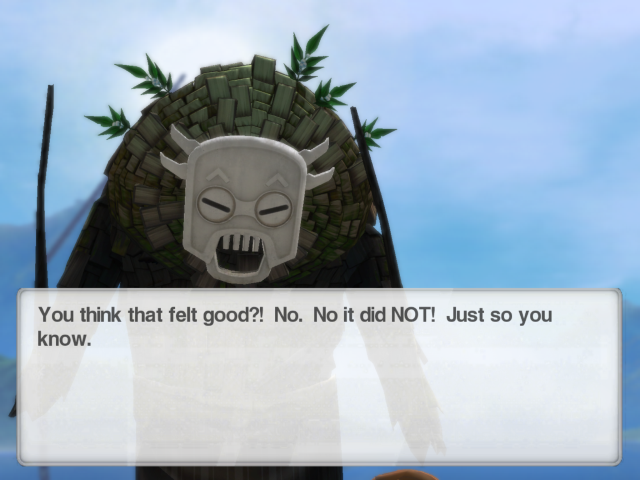 The Spirits have flowers growing out of their backs, and you defeat them by jumping on to them, riding them like a bucking bronco, and pulling the flowers out. There are, of course, certain hindrances – some of the flowers are thorns, the Spirits are trying to shake you off the whole time, and they occasionally break out in bombs.