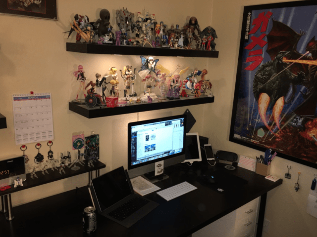 “Play” desk: PC, PS4, PS3 all hooked up to a 28″ 4K monitor. Wonderfully clacky $30 mechanical keyboard which drives my wife mad. Shelves of backlog.