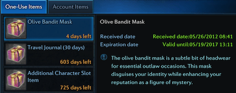 One of the things that I got through ordering the collector’s edition from Amazon was an in-game reward of a cosmetic item called the Olive Bandit Mask – at least, in theory. It’s been in my Item Claim Window ever since, but I’ve never been able to actually get it on any of my characters. I just get an error message when I try to accept the item: