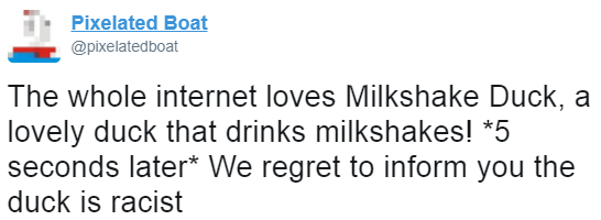 It’s rather famously summed up by the Milkshake Duck tweet, reproduced below on the off chance you’ve never run across it.