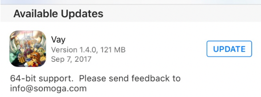 Vay was originally a SegaCD title, but got an iOS release in 2008 and a patch in 2009. I don’t think it’s seen a single update since then, so having it suddenly get a 64-bit patch in 2017 is a bit stunning. It’s a pretty bare-bones port of a super-obscure JRPG, and I doubt they see a ton of sales from it, so serious credit to SoMoGa there.