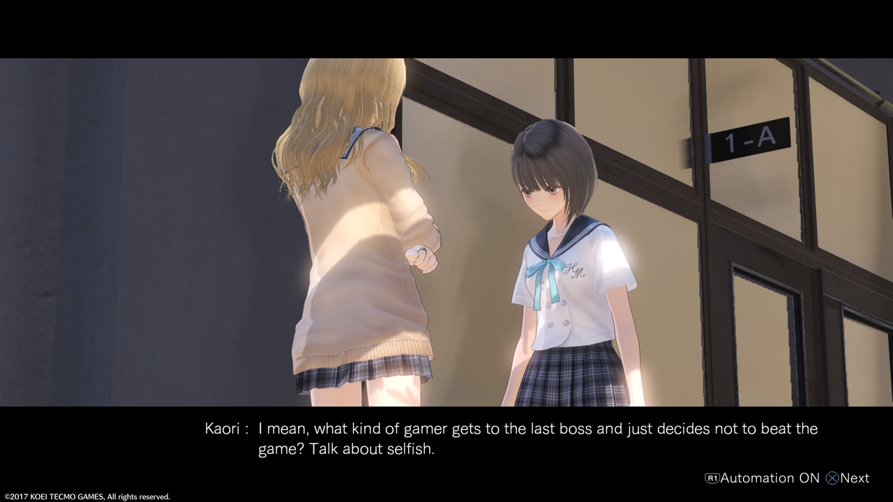 Like I mentioned earlier, Blue Reflection is a very relaxed game and has a similarly low-key main character. You play a former ballerina whose ambitions were cut short by injury – you weren’t permanently crippled, per se, but you will never dance again. For extra angst, you were accepted to your current school because of your ballet talent, but your injury means that you’ve been demoted from the “talented” class to the “normal” class.