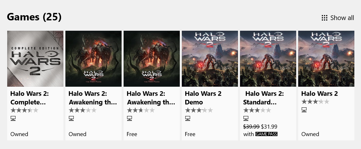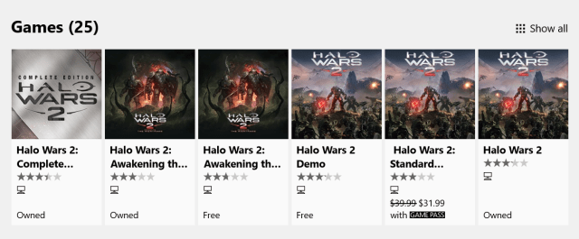 Looking up just “Halo Wars 2” on the Windows Store resulted in finding a listing for both “Halo Wars 2: Standard Edition” and something just called “Halo Wars 2”. “Halo Wars 2: Standard Edition” had a Buy link, and the second one didn’t show up in My Library – but the Install button was active so I went ahead and installed it.