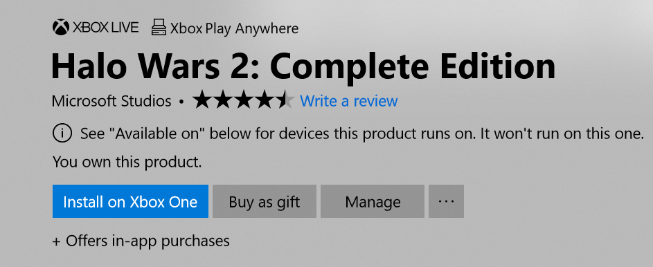 Then, at like 1 AM (with two hours left in the sale!), my resolve broke and I bought Halo Wars 2 Complete. It was priced at $47.99 through the Windows Store and $29.99 on the Xbox Marketplace for some reason, so I bought it on the Xbox – assuming that, as a Play Anywhere title, it would show up on the Windows side of things for me to download.