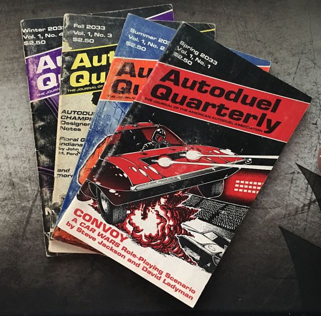 Anyway, part of the shtick of Car Wars was that it was always set 50 years in the future.  So, for example, they published a Car Wars calendar in 1988 that was labeled “2038”, and they published a magazine – Autoduel Quarterly – whose cover dates were always likewise a half-century ahead.  I own about six years’ worth of the magazine, so I can probably track the rough point where I stopped being super into RPGs by when I stopped buying it.
