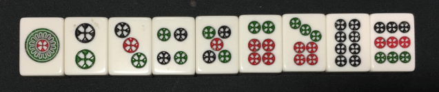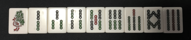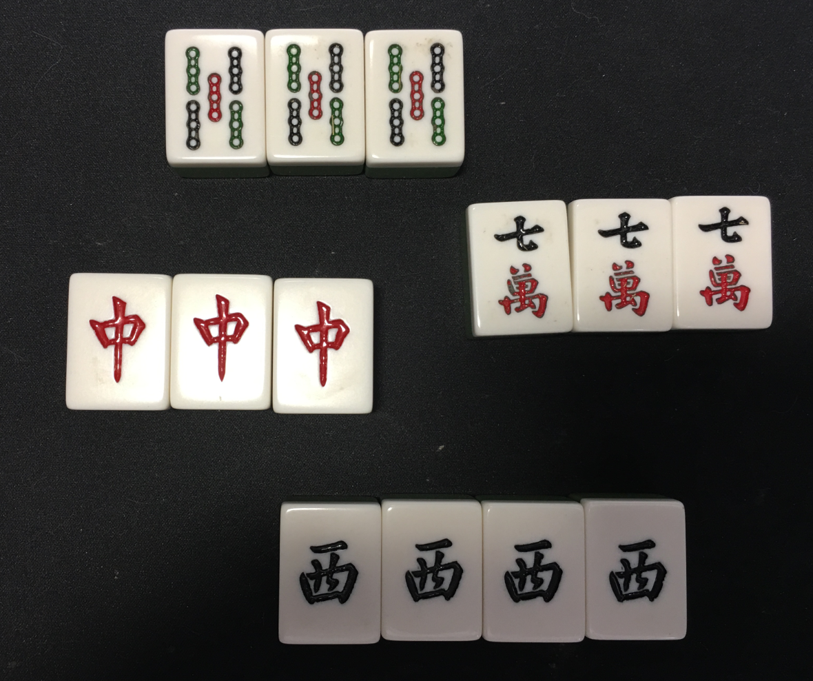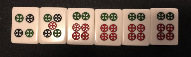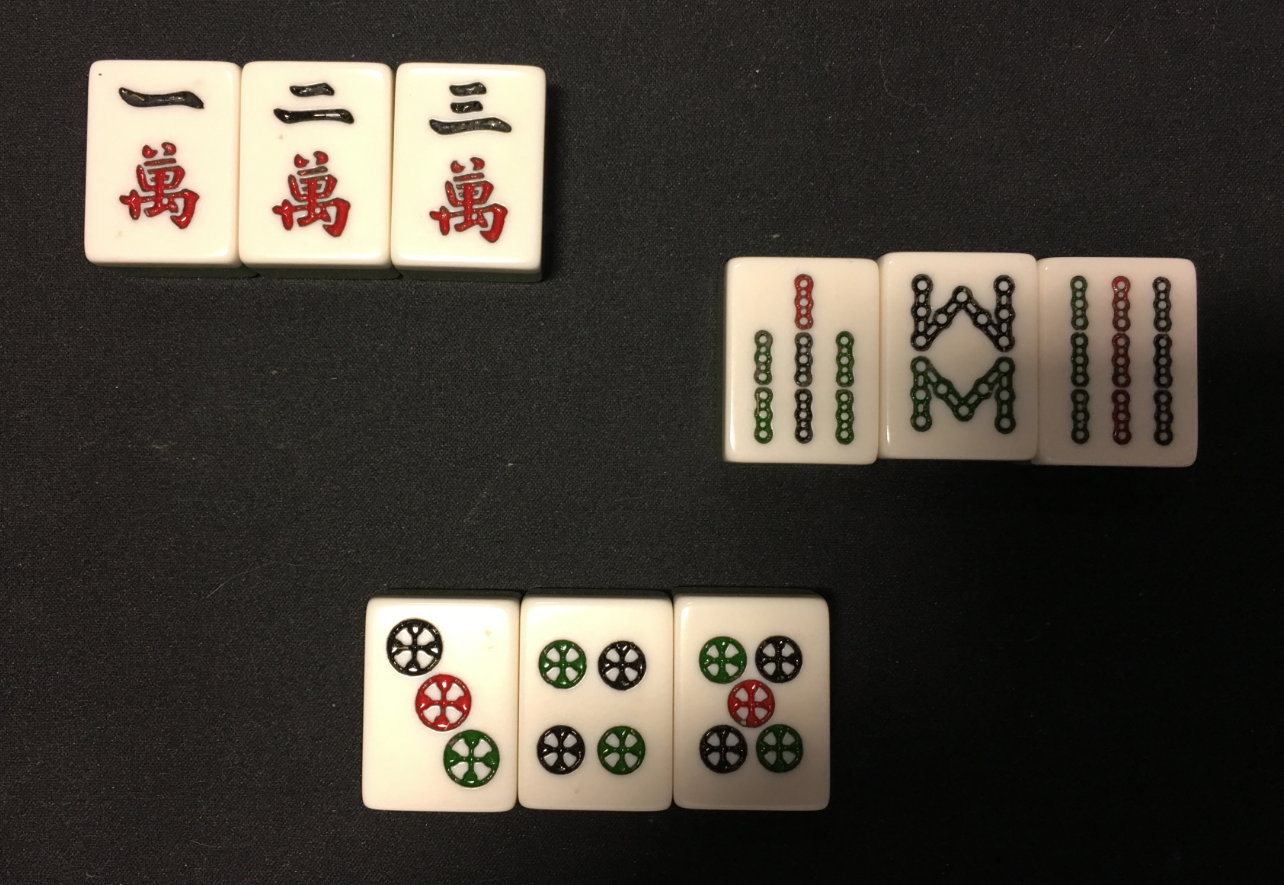 Finally, three terms that you should know. A sequence of three numbered tiles in order is a “chi“, a three of a kind is a “pon“, and four of a kind is a “kan“. You may also see these as “chow, pung, and kong” which are the Chinese terms for the same things.