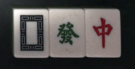 White, Green, and Red dragons.  In a lot of games, the white dragon is a completely blank tile.  I’m just using pictures of the tiles from my own set here, and my set happens to have a decorative border on the white dragons.