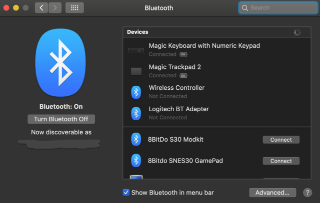 Syncing it was literally as easy as opening the bluetooth preferences pane and pressing the start button on the gamepad, then selecting the “8BitDo S30 Modkit” device.