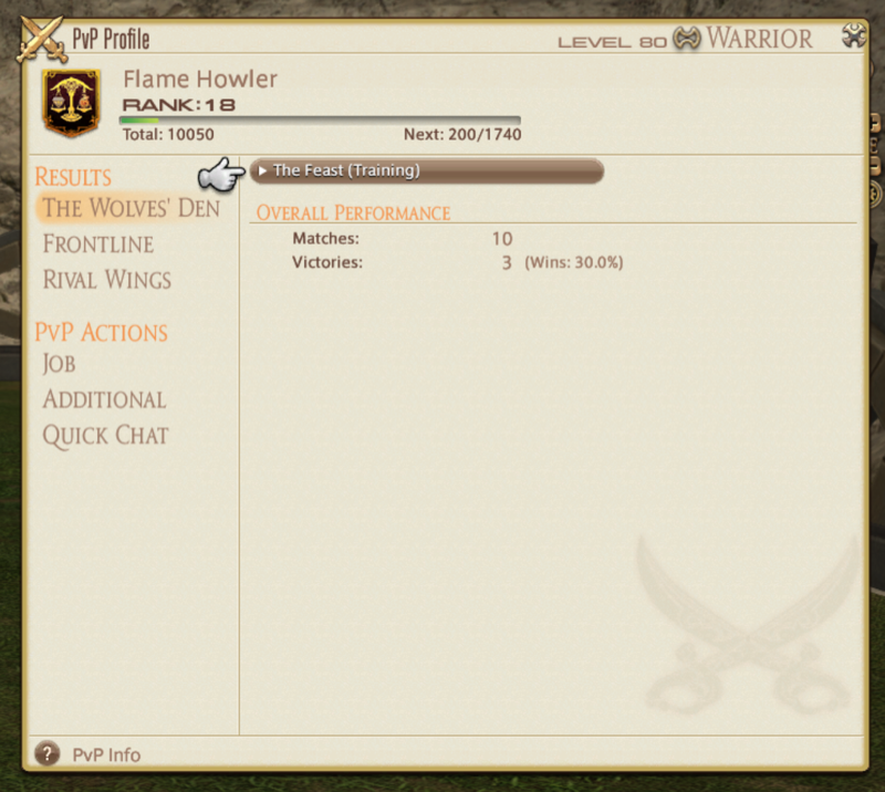 FFXIV PvP has three modes. “The Feast”, which is an affair that drops your four-man team into a small arena with another four-man team and asks you to kill the heck out of each other, “Frontlines”, which drops three 24-man teams into a much larger arena and asks you to kill the heck out of each other and also periodically do some objectives that I never really got the knack of, and “Rival Wings” which drops two 24-man teams into a MOBA, where you have a bunch of NPCs running around in addition to all of the other players that you need to kill the heck out of. Rival Wings was particularly difficult to understand going in blind, so I only played one match of it.