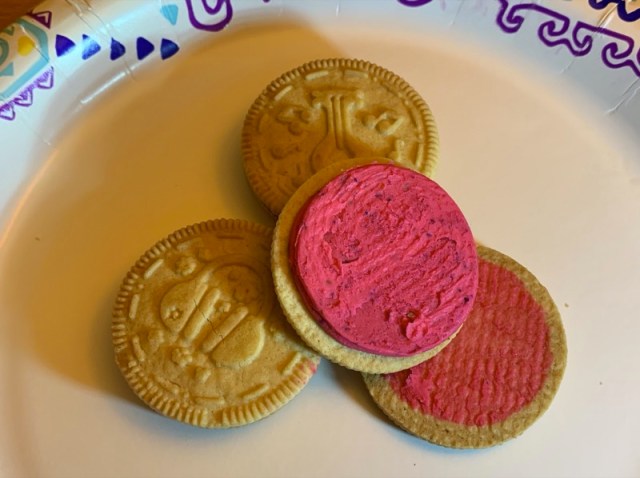The filling is not particularly glittery but it IS pink. Not a pleasant pink, either. I am very fond of the sort of coral pink that Nintendo used for its pink handhelds. This is not that. It’s an aggressive pink, the sort that screams that these cookies are NOT FOR LADS.