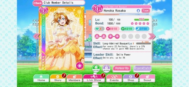 Note also the “Level” and “Bond” here. “Level” is the card level, which you increase by feeding other cards to this card. So to get a level 100 UR card, I have shoveled an endless supply of lesser idols into Honoka’s gaping maw.