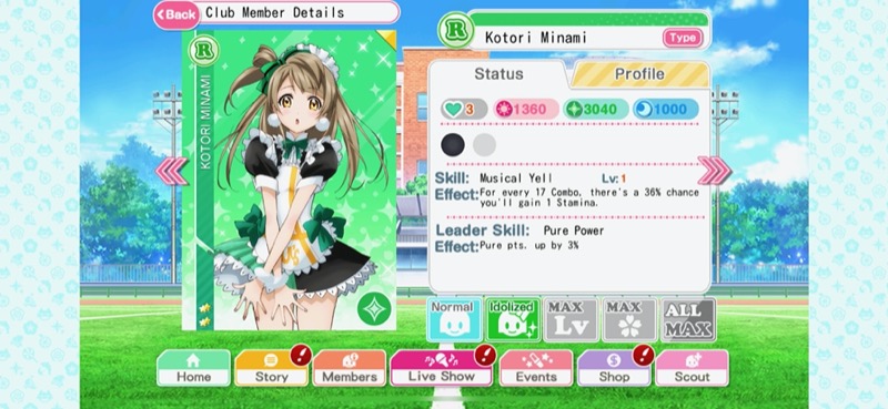 Here’s a typical rare card. Despite the name, “Rares” are quite common and you can get these with non-premium currency. The “1360”, “3040” and “1000” values on this card represent its strengths, which translate to the score you will get when hitting notes when using this card as one of your team members in the rhythm game.