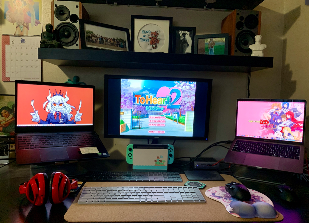 The MacBook on the right is my 2018 MBP. I buy a new Mac roughly every 3 years, but I think this one is going to break that pattern. It’s a ridiculously thin and fast piece of kit, and the sole problem I have with 13″ MacBooks was resolved by hooking up a cheapish eGPU box and slapping an RX 590 in it. In addition to the eGPU, it’s connected to a CalDigit TS3+ Thunderbolt dock that handles ethernet and audio and has every kind of port you could ask for.