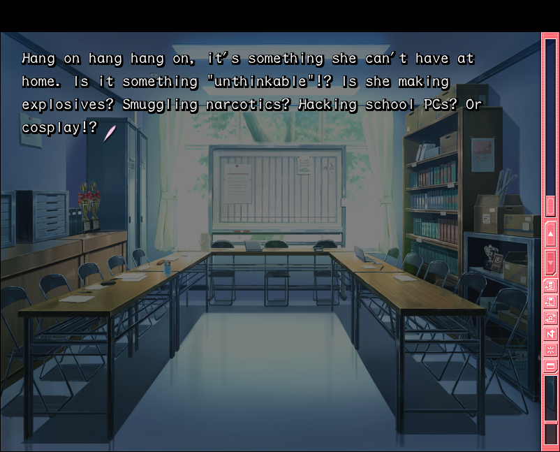 I also have to pray that the main character is SLIGHTLY less clueless in the other routes, because the only reason I managed to get to first base with Sasara is that the rest of the cast eventually got tired of my whining about how I wasn’t worthy and devised a complicated scheme to get me to stop waffling and just get on with it.