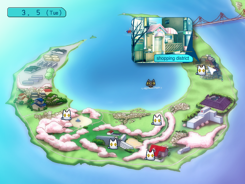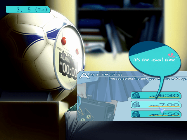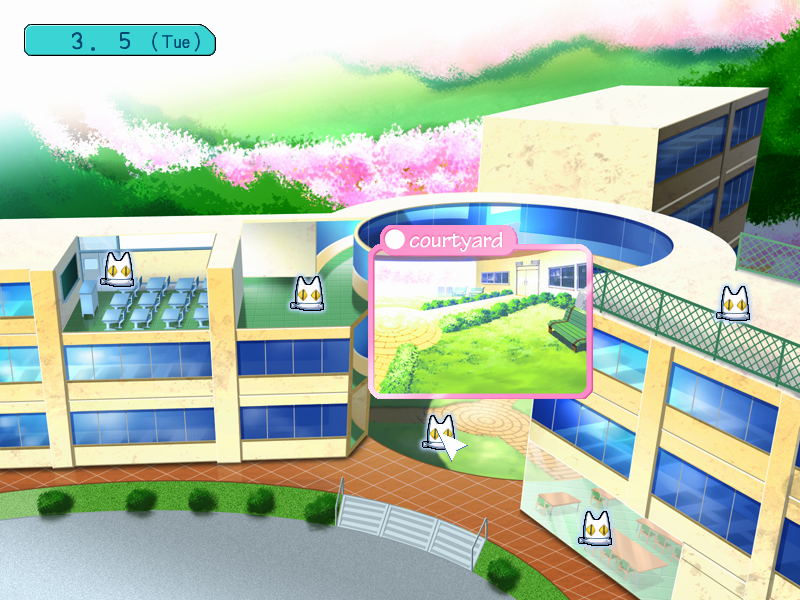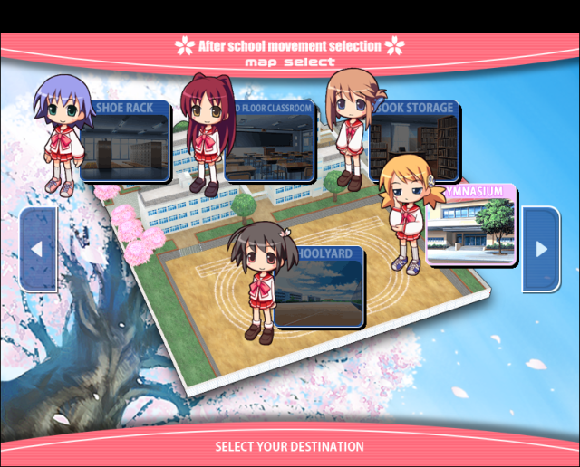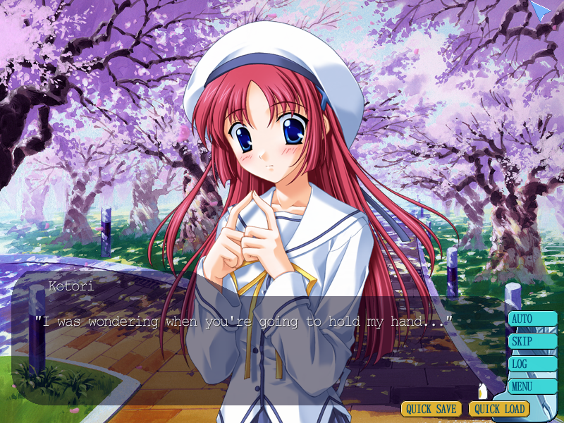 It’s… well, I didn’t really like it much. It plays a lot like ToHeart2, where you go to school in the morning and then decide where you’re going to go on your lunch break and where you’re going to go after school, and adds a question of when you are going to get up in the morning. The combination of these choices determine which girl you are going to run in to on any given day, and once you have stalked a particular girl enough times you are locked into her storyline which leads inevitably to some HOT AND STEAMY HAND HOLDING ACTION.