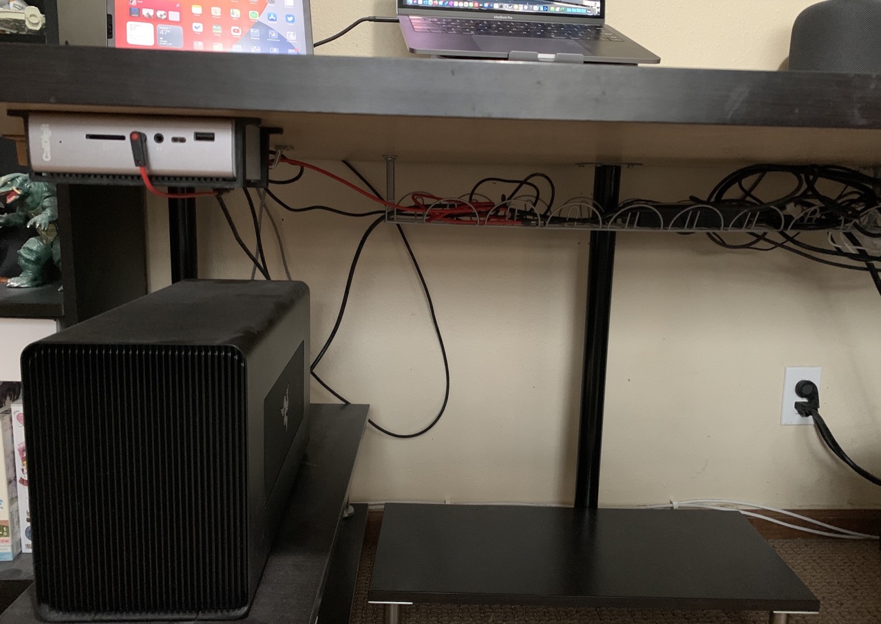I’m told that you shouldn’t chain an eGPU off a hub, for performance reasons, but I still get 60fps in WoW and FFXIV with it set up like this so I’m good. I’ll likely be moving away from the eGPU once the 16″ Apple silicon-based Macbooks come out, and that will get rid of the most annoying remaining cables.