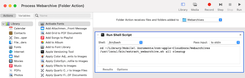 And from the Mac Mini, I could create a Folder Action through Automator to watch the iCloud Drive folder for new files and run my script against the folder. So now I can drop manga chapters into this folder one at a time and the script will build a .cbz file out of them, which I can then copy back into iComics on the iPad.