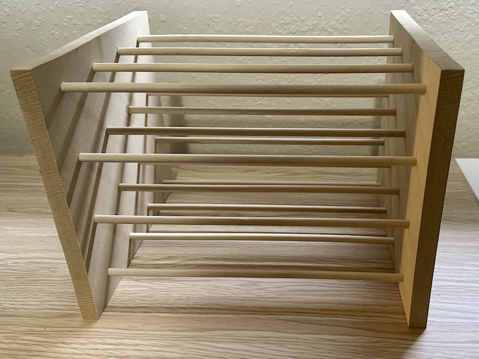 Enter my latest woodworking project, made from about five bucks of dowels and a hunk of MDF I had lying in the scrap bin in the garage.