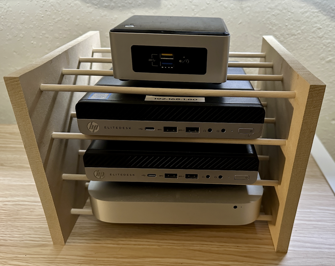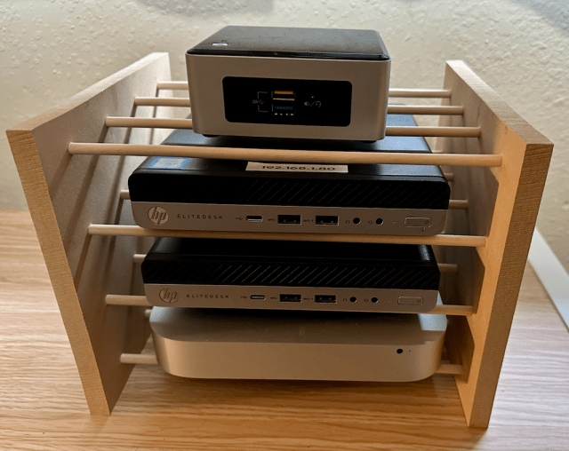 It fits the EliteDesks, a Mac mini and a NUC very well, and I didn’t spend any money on Amazon. Plus I feel super manly for actually getting to use power tools.