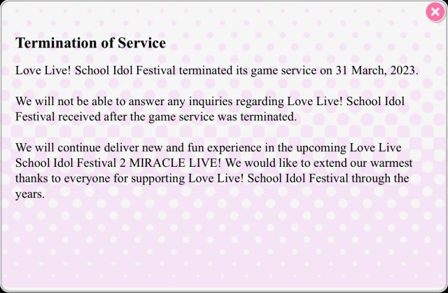 OK. It’s inaccurate to say I’ve “escaped” gacha idol hell, because I didn’t really escape it. After 9 years of service, the plug got pulled on Love Live: School Idol Festival, sending all of my hard-earned idol .pngs to a black hole.