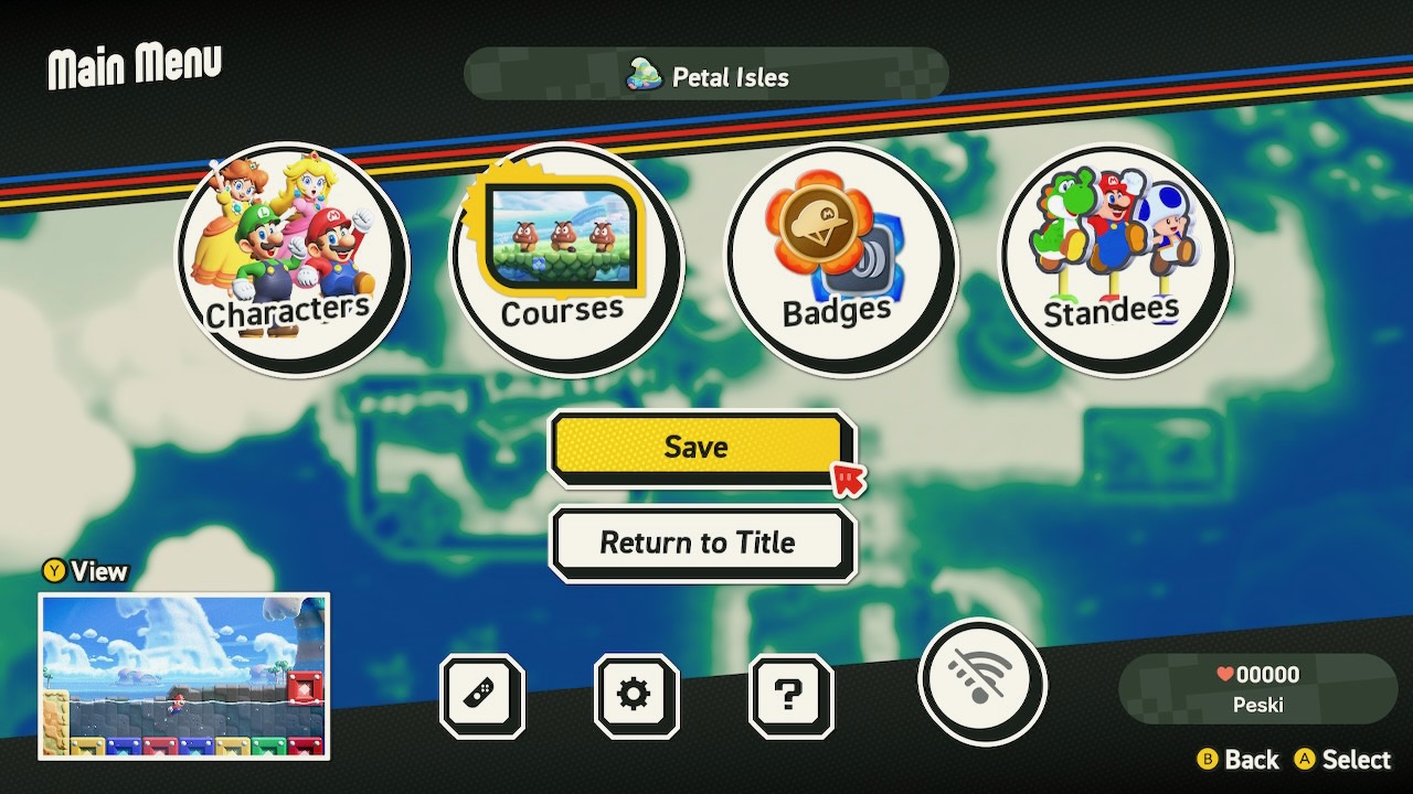 You can save the game whenever you want. You don’t need to play a certain number of levels to earn a save, or get to a Toad house that lets you save once, or any other nonsense. Open menu, press save, done.