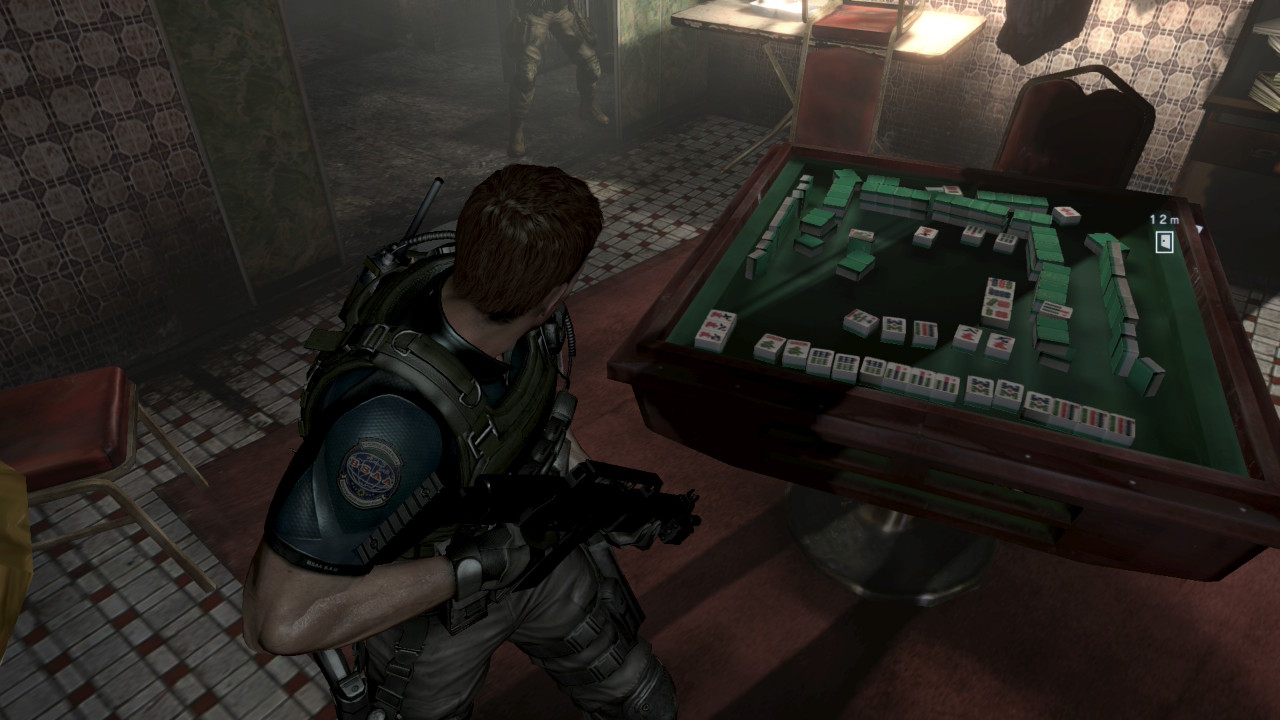 Normally I post screenshots of the various computers seen in these games and speculate what they were meant to represent, but neither RE5 nor RE6 had anything particularly interesting going on in that regard. Rather I will post a screenshot of some guy’s extremely nice winning mahjong hand. I’m sure that about five minutes after this guy laid these tiles down he was either (a) turned into a zombie or (b) eaten by zombies, but for those five minutes I bet he was awfully happy.